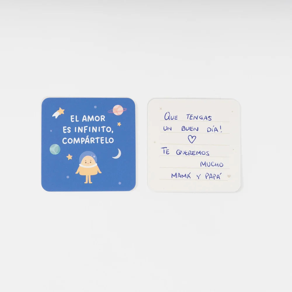Coloca una tarjeta en la merienda o en la mochila, y deja que cada mensaje alegre su día.